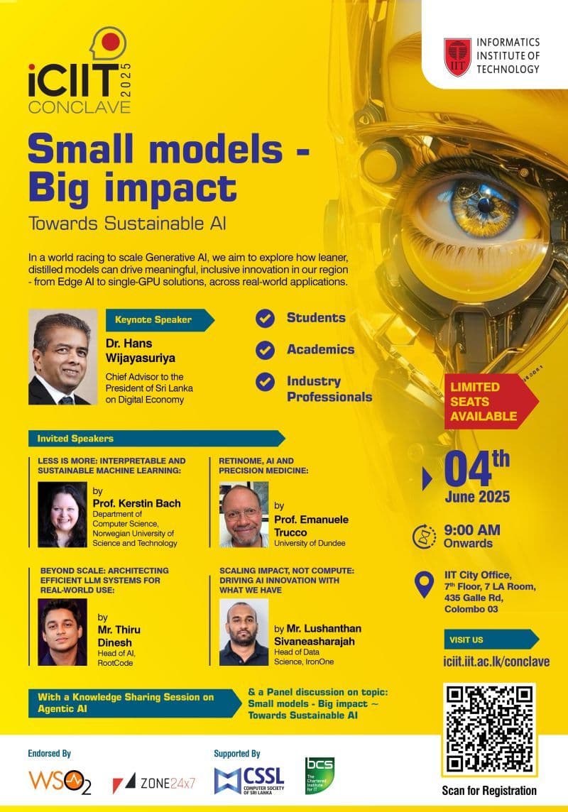 Attended iCIIT Conclave 2025, a day of cutting-edge insights and inspiring discussions on AI, technology, and digital transformation in Sri Lanka. Highlights included Dr. Hans Wijayasuriya on accelerating the digital economy, Prof. Kerstin Bach on interpretable and sustainable AI, Prof. Emanuele Trucco on AI in precision medicine, and sessions on agentic AI, efficient LLM systems, and sustainable AI practices. The conclave offered a deep dive into practical AI applications, scalable solutions, and the future of technology.